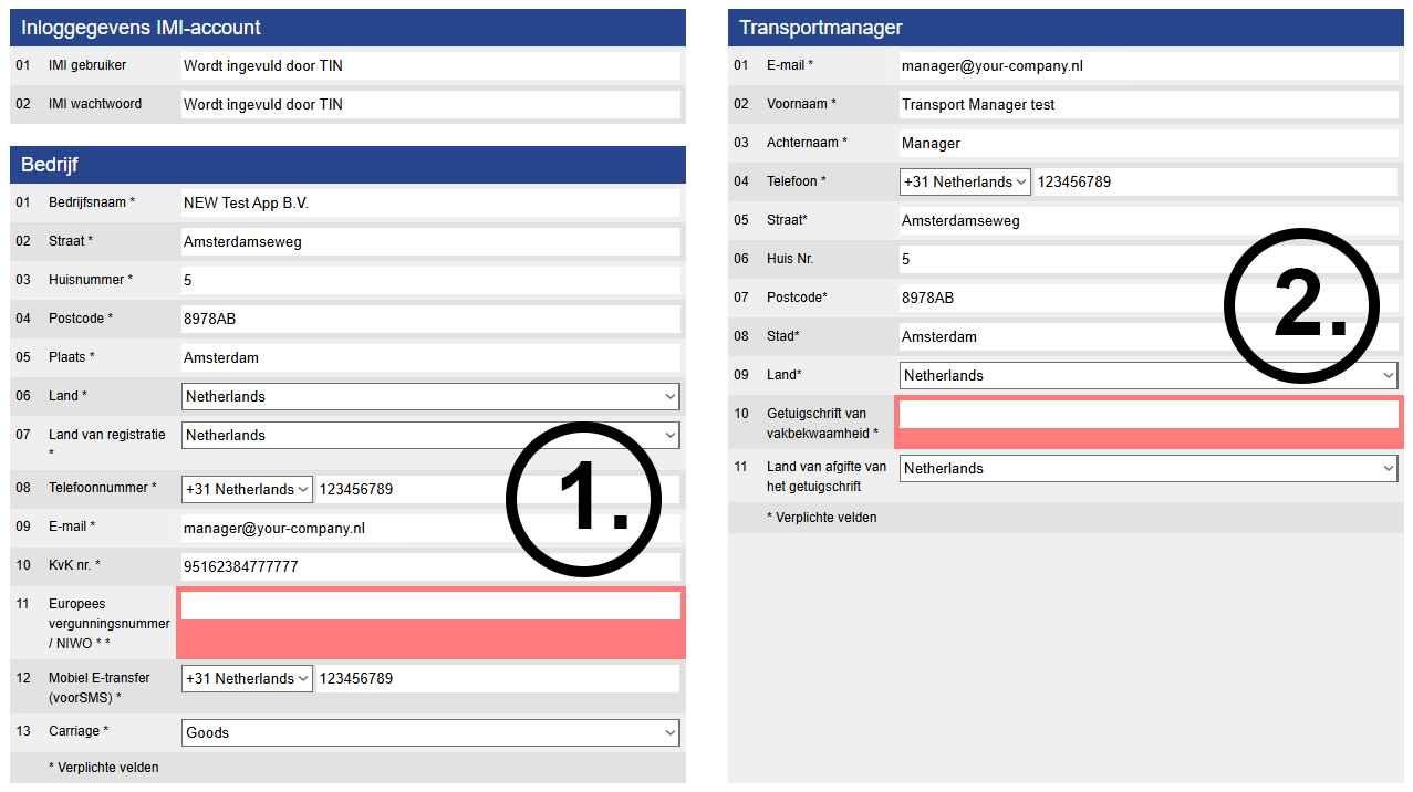 Wij willen u vragen ZO SPOEDIG MOGELIJK het vakbekwaamheidsnummer (2) van de vervoersmanager en het NIWO-nummer (1) in te voeren in ons CRM-systeem.